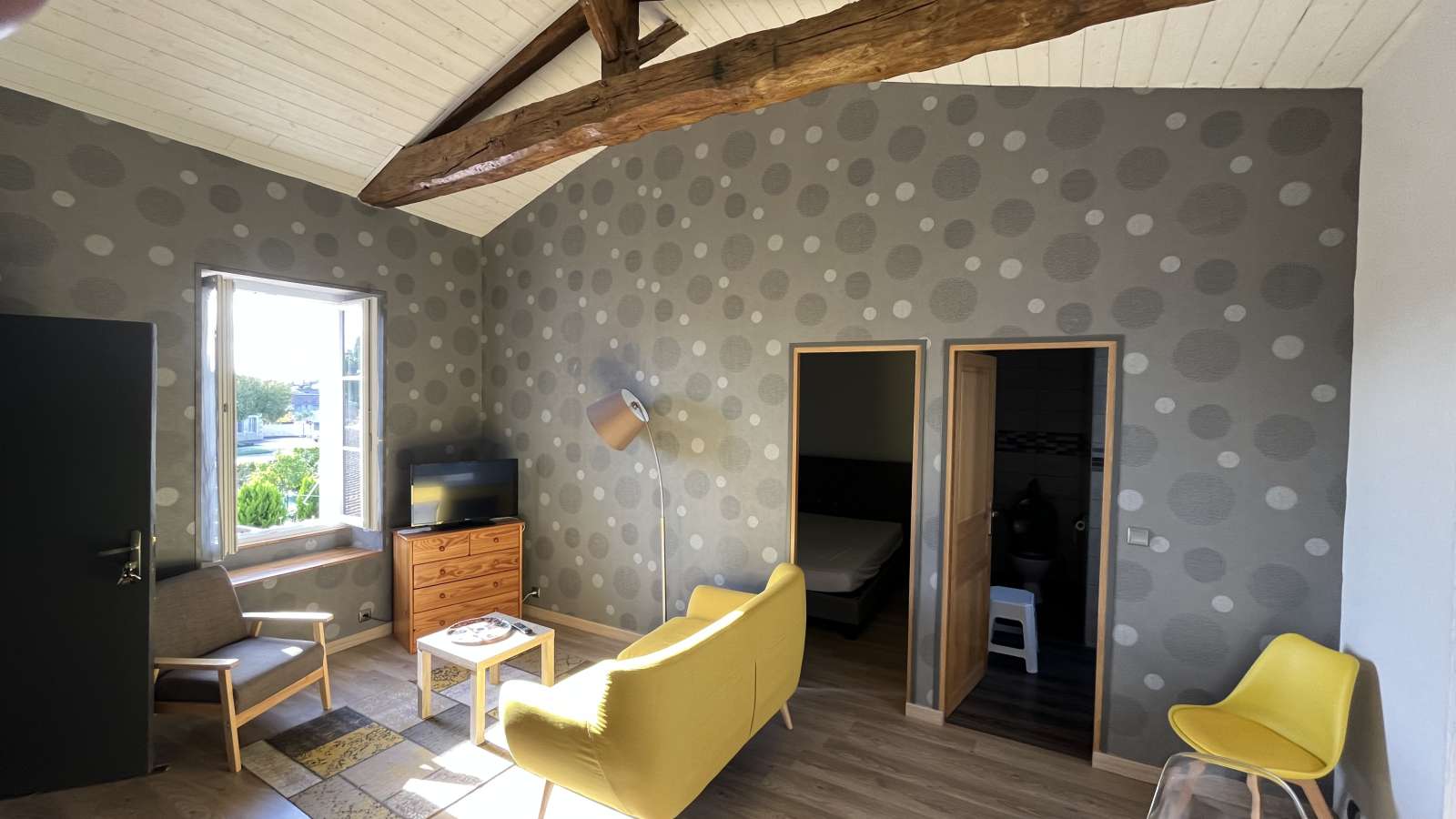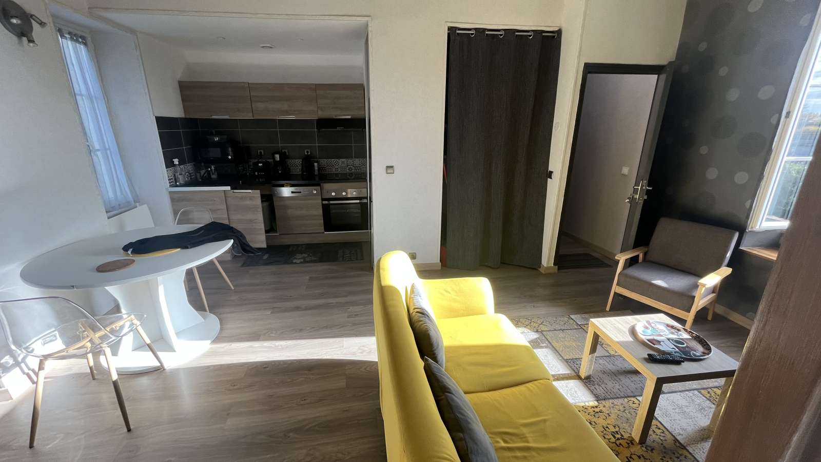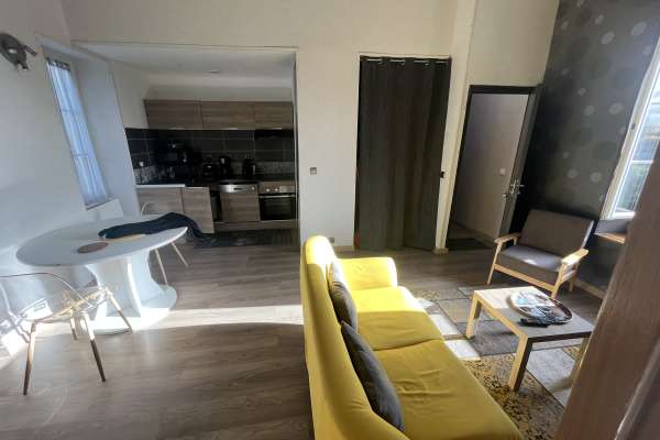 Appartement refait à neuf situé à l'étage située en centre-ville à proximité immédiate des différents commerces et des animations de la ville. Séjour traversant. Suite à un escalier, vous entrerez dans l'appartement avec séjour (39m²) lumineux, traversant et en cathédrale dont les poutres sont apparentes. Cuisine ouverte et équipée (lave-vaisselle). Une grande chambre double de 13m² avec un lit de 160cm par 200cm. Une vaste douche à l'italienne de 120cm par 80cm. Le + de cet appartement est la vue sur le clocher de l'église de Jonzac. Logement situé en cœur de ville à 300 mètres du château et 200 mètres du marché couvert. Les thermes se trouvent à 1,2 km et le centre aqualudique des "Antilles de Jonzac" à 1,5 km.
