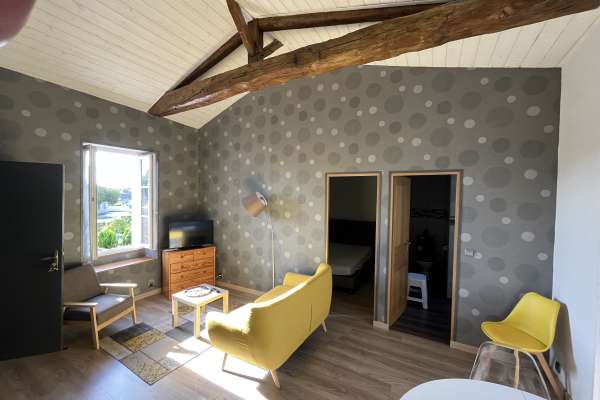 Suite à un escalier, vous entrerez dans l'appartement avec séjour (39m²) lumineux, traversant et en cathédrale dont les poutres sont apparentes. Cuisine ouverte et équipée (lave-vaisselle). Une grande chambre double de 13m² avec un lit de 160cm par 200cm. Une vaste douche à l'italienne de 120cm par 80cm. Le + de cet appartement est la vue sur le clocher de l'église de Jonzac.