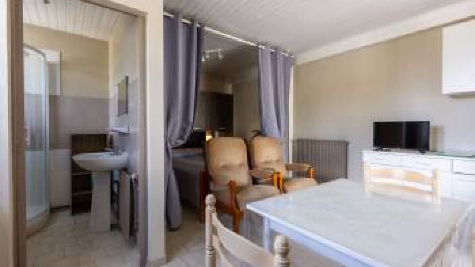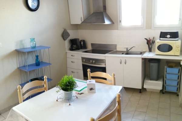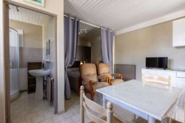 Studio au rez-de-chaussée situé à 50m des Thermes Situé à 500m du centre-ville et à proximité du centre aqualudique des "Antilles de Jonzac", comprenant un coin cuisine entièrement équipé, un coin chambre, accès Wifi. Bénéficie d'un hall d'entrée. Linge literie et toilettes fournis. Laverie en commun : lave-linge et sèche-linge avec supplément.