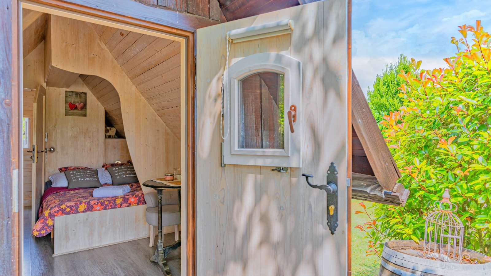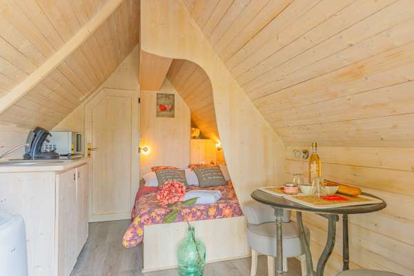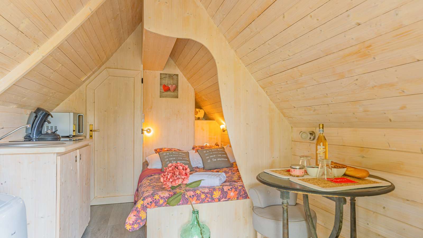 Toute équipée avec salle d'eau et WC privatifs, d'un coin cuisine (frigo, table à induction deux feux, une Senseo), d'un lit deux personnes en 140, d'une petite terrasse avec table de jardin.