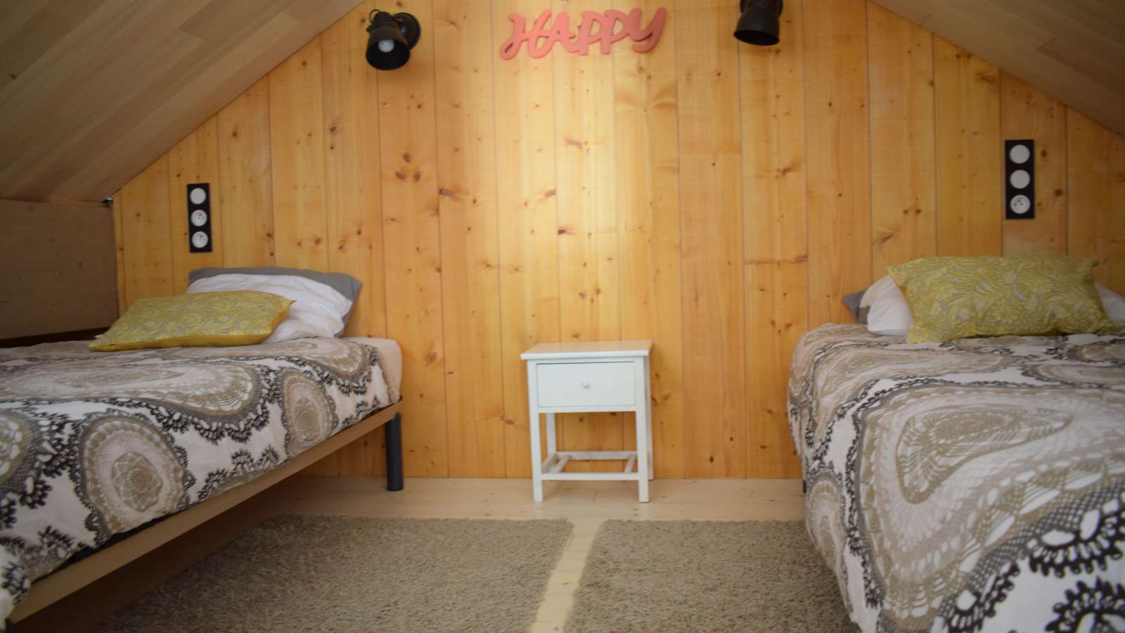 Elle comprend une chambre avec 1 lit de 160 cm, une salle d'eau avec douche, toilettes, lavabo, une mezzanine avec 2 lits de 90 cm, une cuisine (table à induction, réfrigérateur/congélateur, cafetière Senseo, bouilloire, grille-pain, micro-onde multifonctions), un salon avec lit gigogne, une télévision à écran plat 110 cm, une terrasse et table de jardin, chauffage et climatisation.