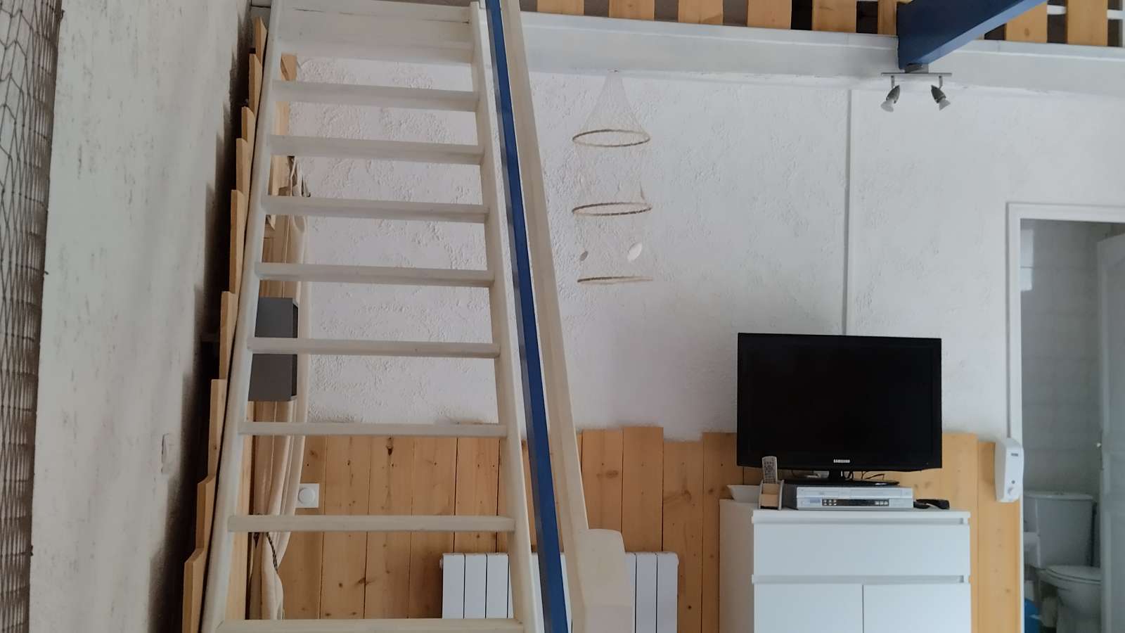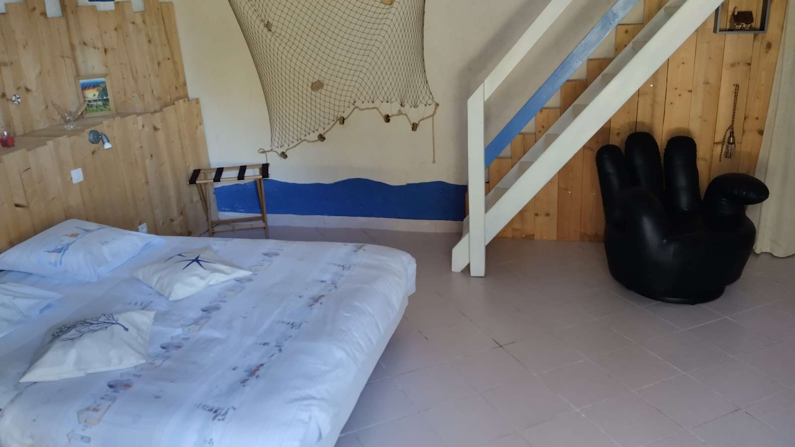 - Chambre OCEAN (40 m²) pour 5 personnes, équipée d'un lit de 160x190, d'une TV, d'un fauteuil, d'une salle d'eau avec cabine de douche au rez-de-chaussée, d'un lit de 140x190 et d'un lit de 90x190 au 1er étage, en mezzanine, et d'un salon de jardin à l'extérieur.
