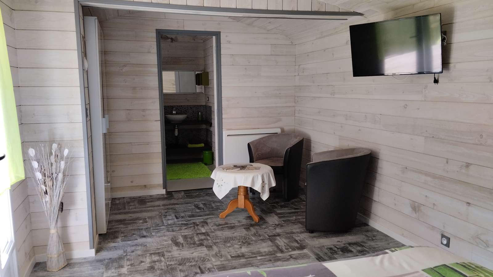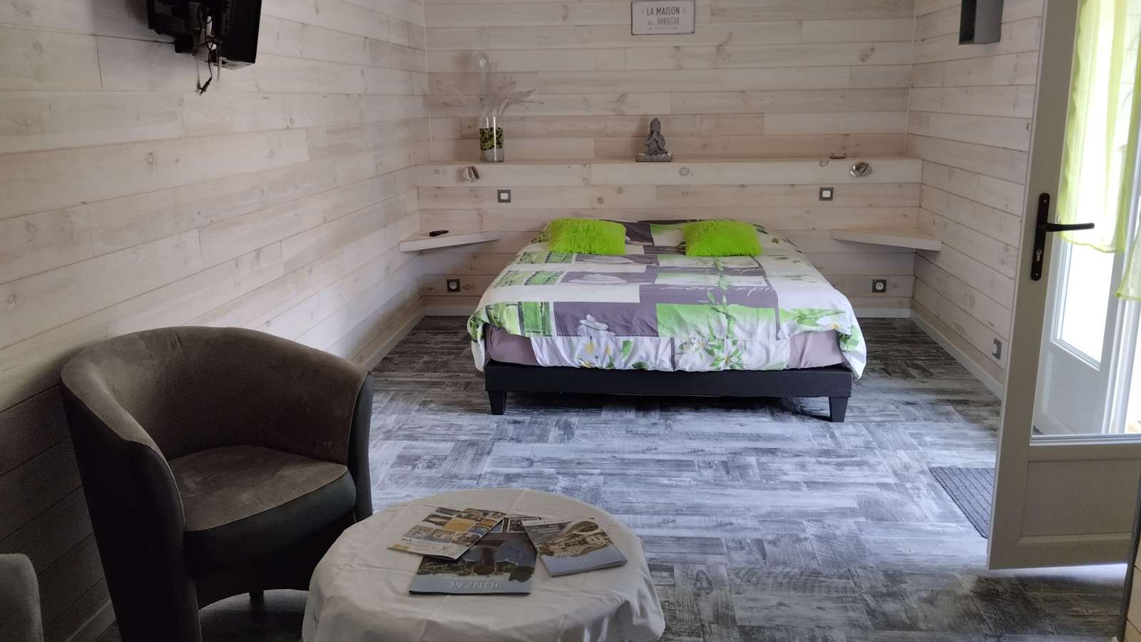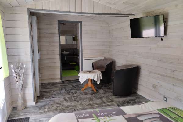- Chambre NATURE (20 m²) pour 2 personnes, équipée d'un lit de 160x190, d'un petit coin salon avec TV, d'une salle d'eau avec douche à l'italienne et d'une petite terrasse avec salon de jardin à l'extérieur.