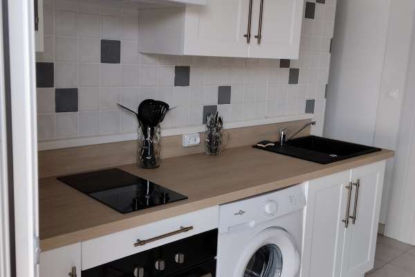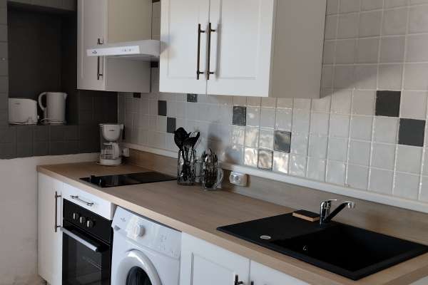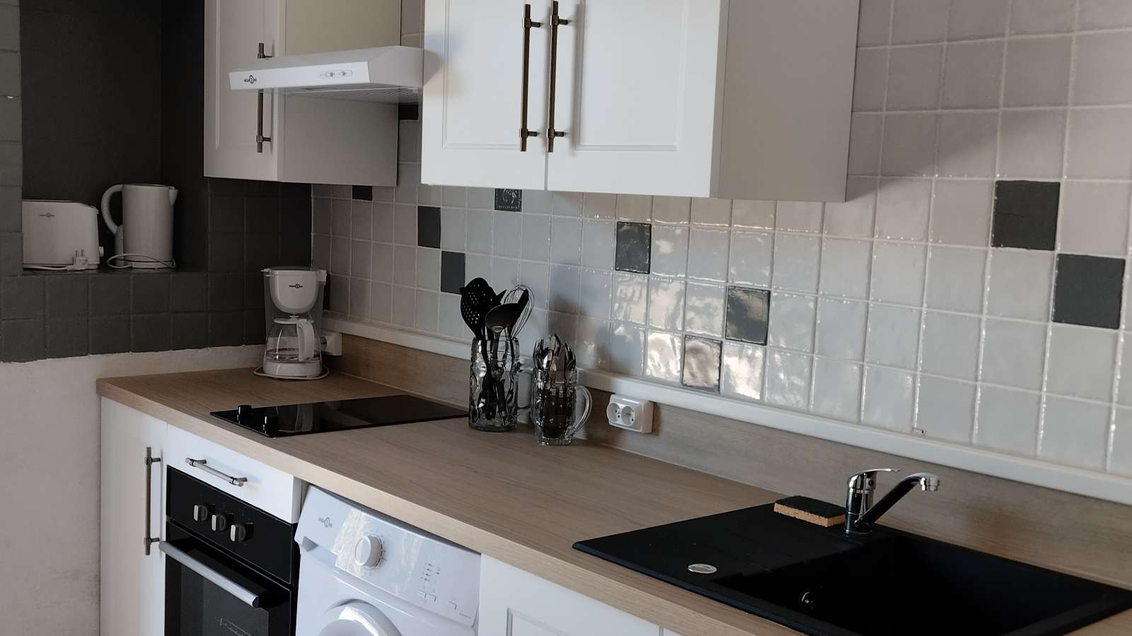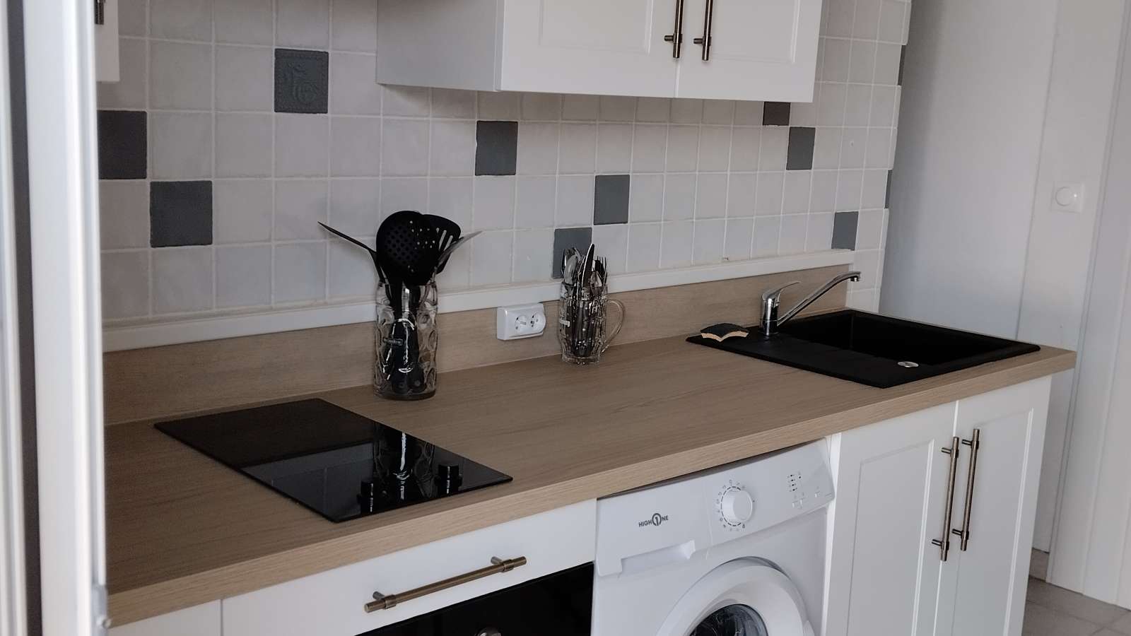 - d'une cuisine aménagée et équipée de four micro-ondes, four, plaque induction, lave-linge, combiné frigidaire/congélateur, grille-pain, cafetière à filtre, cafetière NESPRESSO et bouilloire,