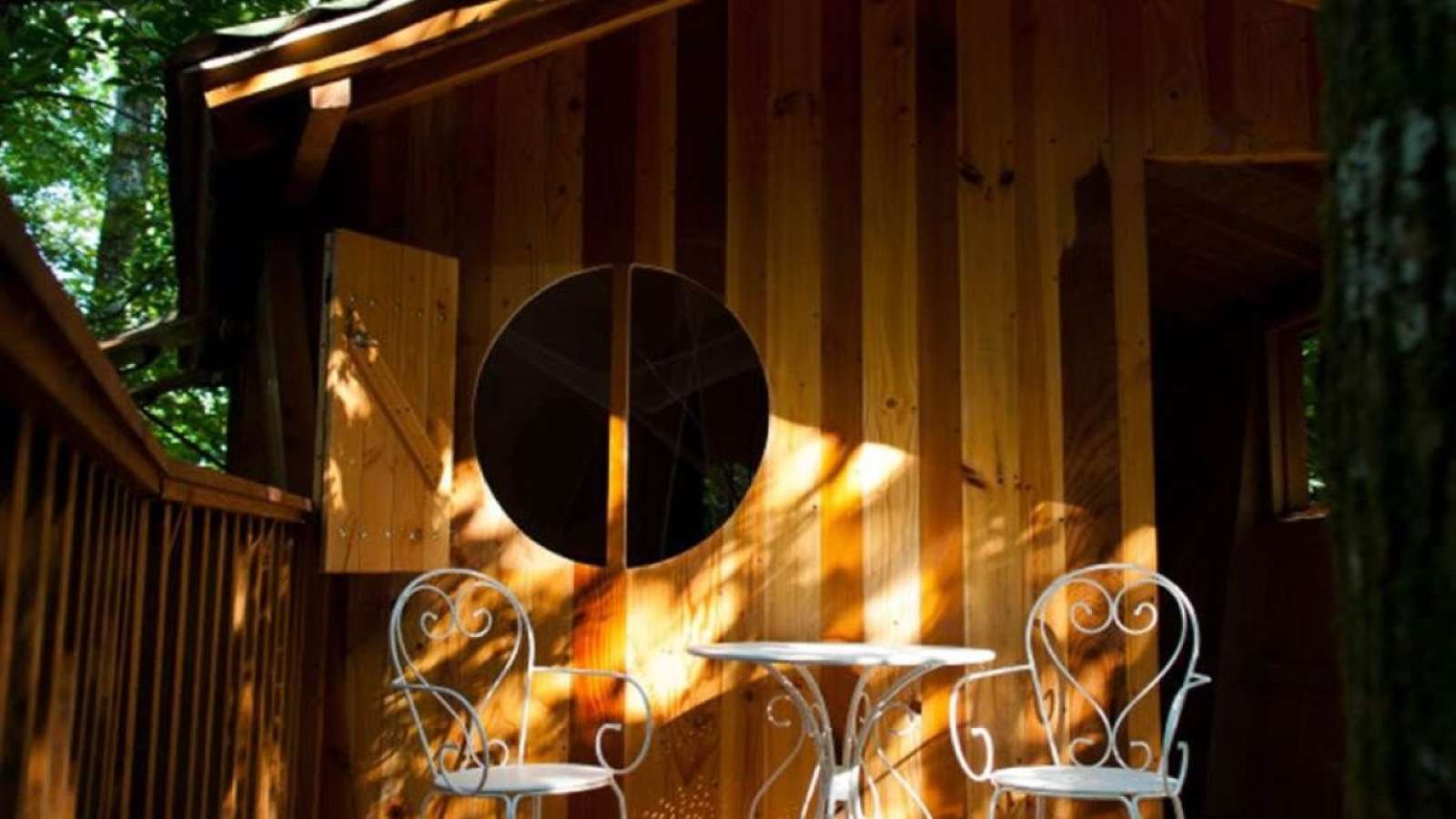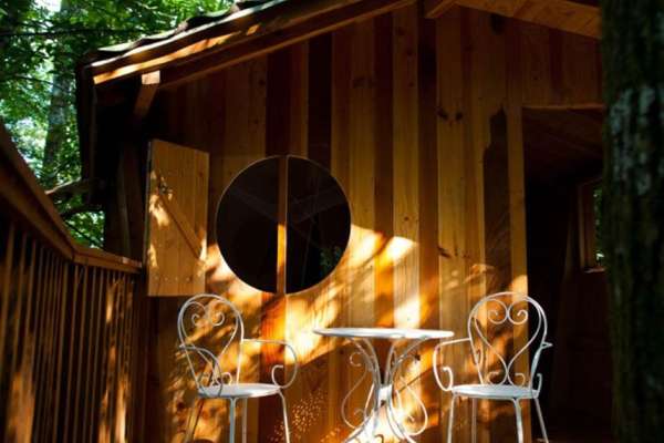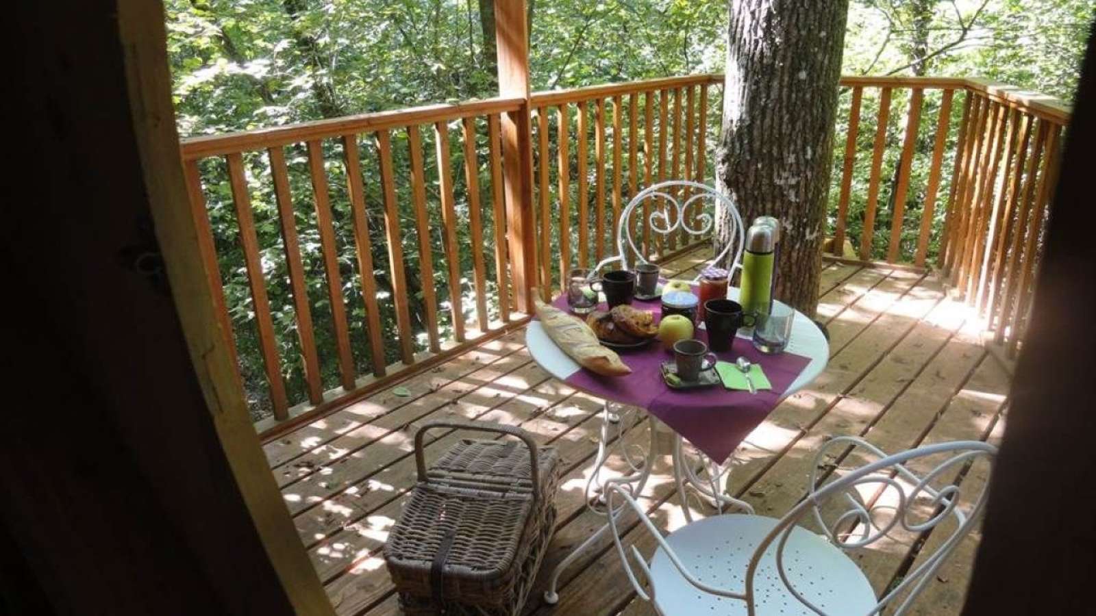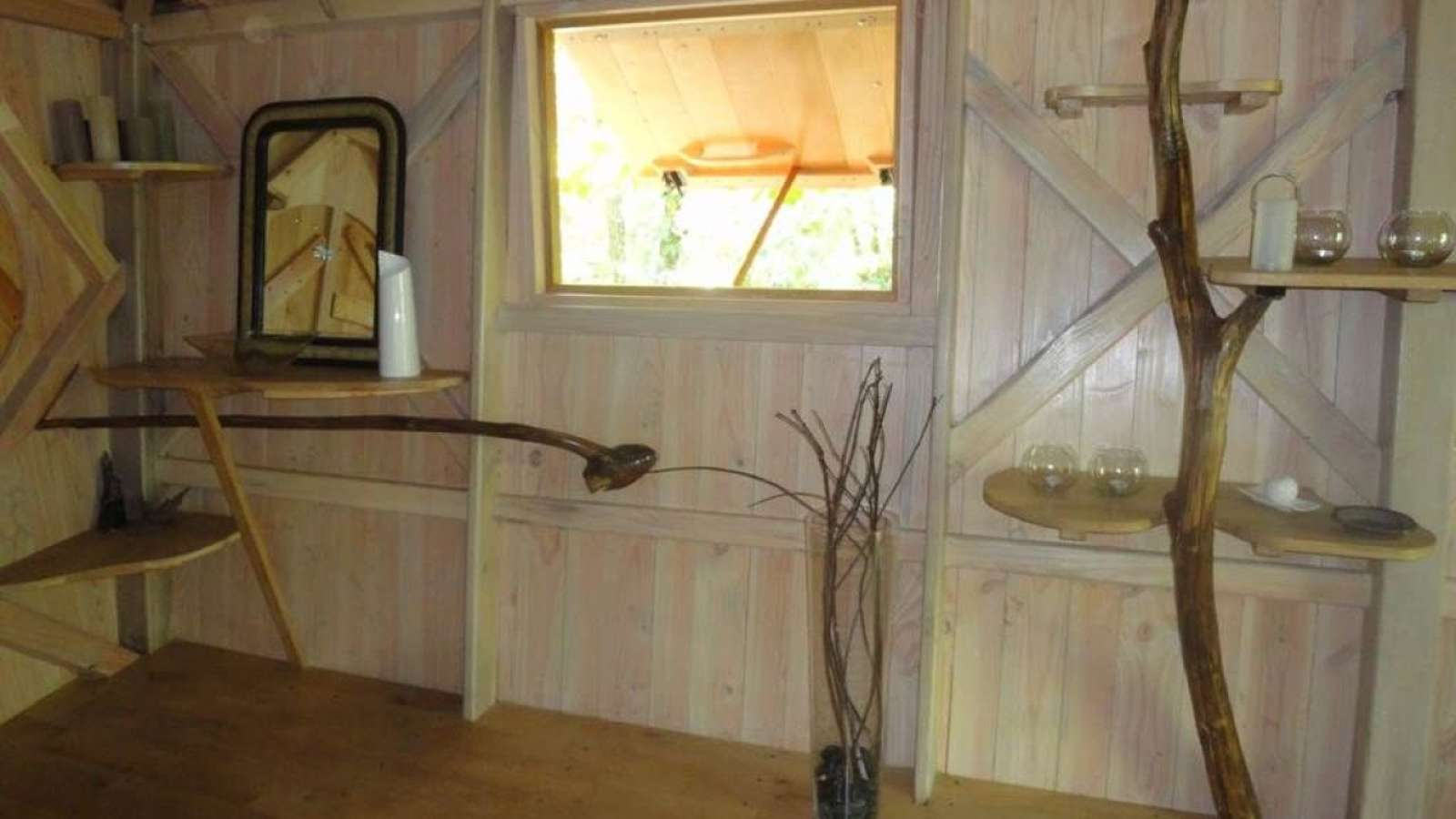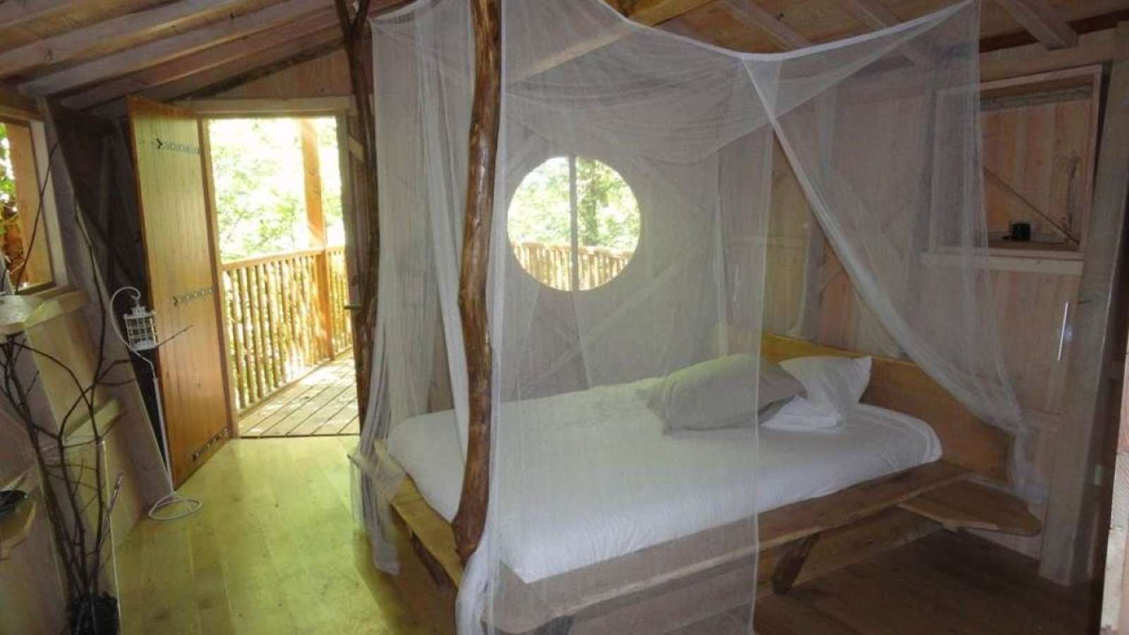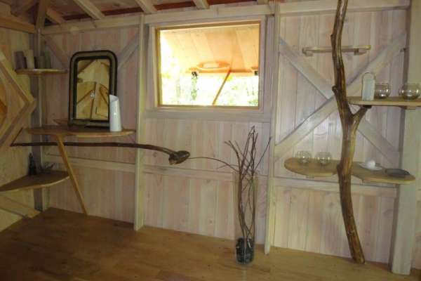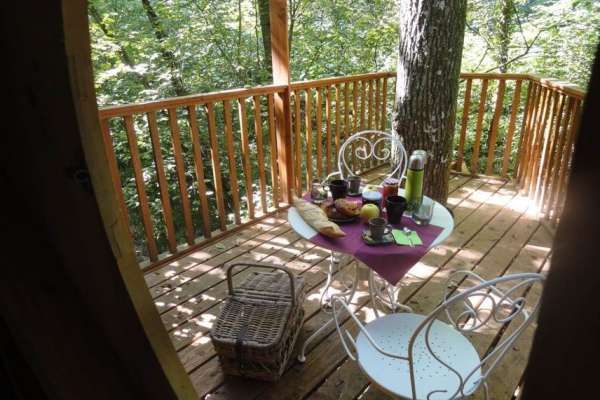 Perchée à 4,5 mètres de hauteur, on y accède à l'aide d'un escalier en colimaçon. Le lit à baldaquin conçu avec des branches de châtaignier ne manquera pas de vous séduire. Spacieuse et cosy, elle s'ouvre sur une terrasse suspendue au milieu des arbres... idéale pour prendre un verre le soir en amoureux à la lueur des bougies et savourer son petit déjeuner le matin avec les oiseaux et les écureuils. La cabane est accessible aux enfants à partir de 10 ans. La cabane Isabelle es équipée de toilettes sèches mais votre clef vous donne accès à une salle d'eau privative où vous pourrez laisser vos affaires de toilettes. Le petit déjeuner pour 2 personnes est compris. Votre panier sera accroché au bout de la corde à l'heure de votre choix et vous n'aurez plus qu'à le hisser jusqu'à vous grâce à la petite poulie. Vous y trouverez à l'intérieur (par personne) : du café, du thé ou du chocolat, un jus de fruits, un yaourt BIO, une demie-baguette, du beurre, de la confiture maison et un fruit.