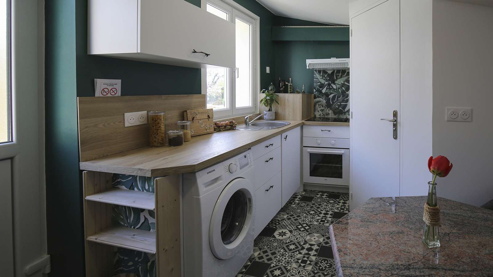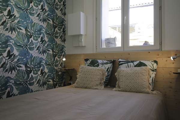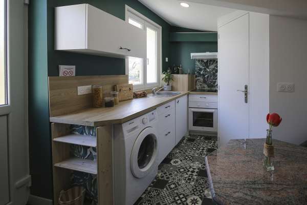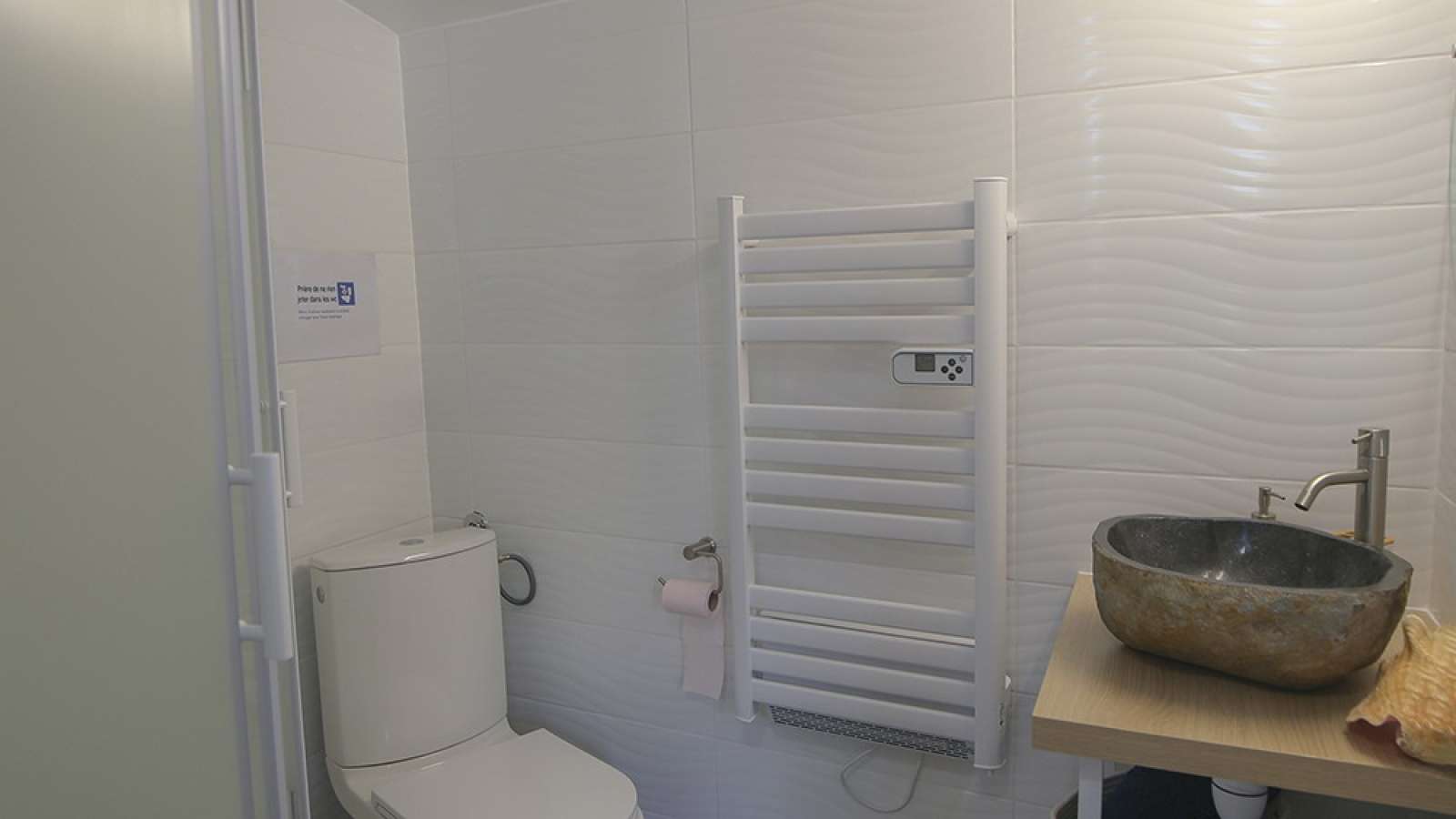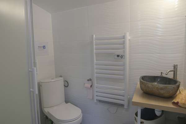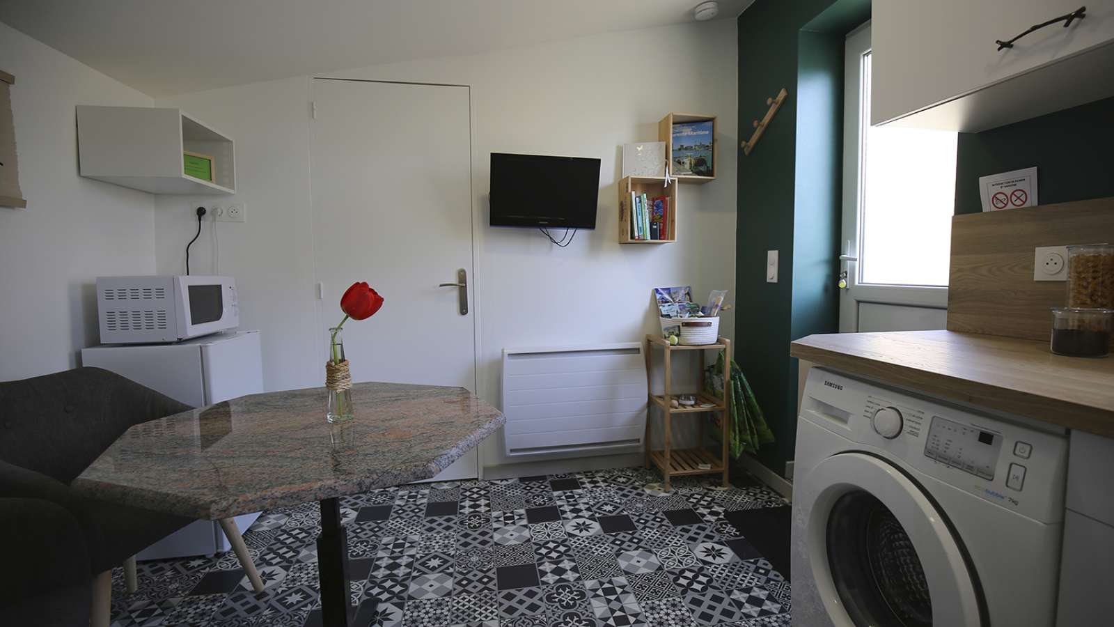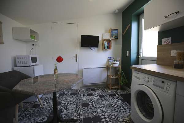 Le logement est équipé d'une salle d'eau avec douche, wc et lavabo, une chambre avec un lit double (140) et d'une pièce ouverte avec cuisine équipée et télévision.
