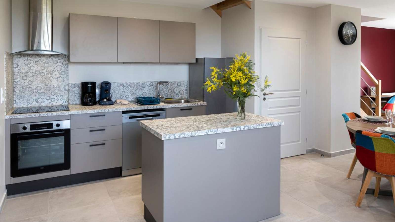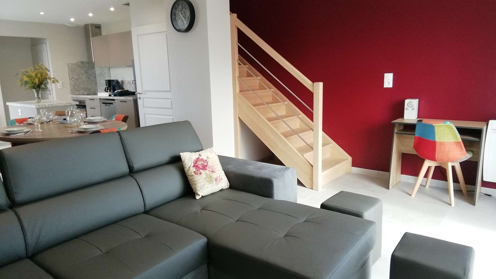 Au rez-de-chaussée, une vaste pièce de vie avec son espace cuisine et son ilot central, fonctionnel. Le séjour et le salon vous offrant un large canapé d'angle donnant sur une baie vitrée avec TV/HD connectée, radio, wifi, livres, revues, jeux de société et un espace bureau. Salle de bain: meuble double vasques, douche à l'italienne et radiateur sèche-serviette soufflant. WC indépendant.