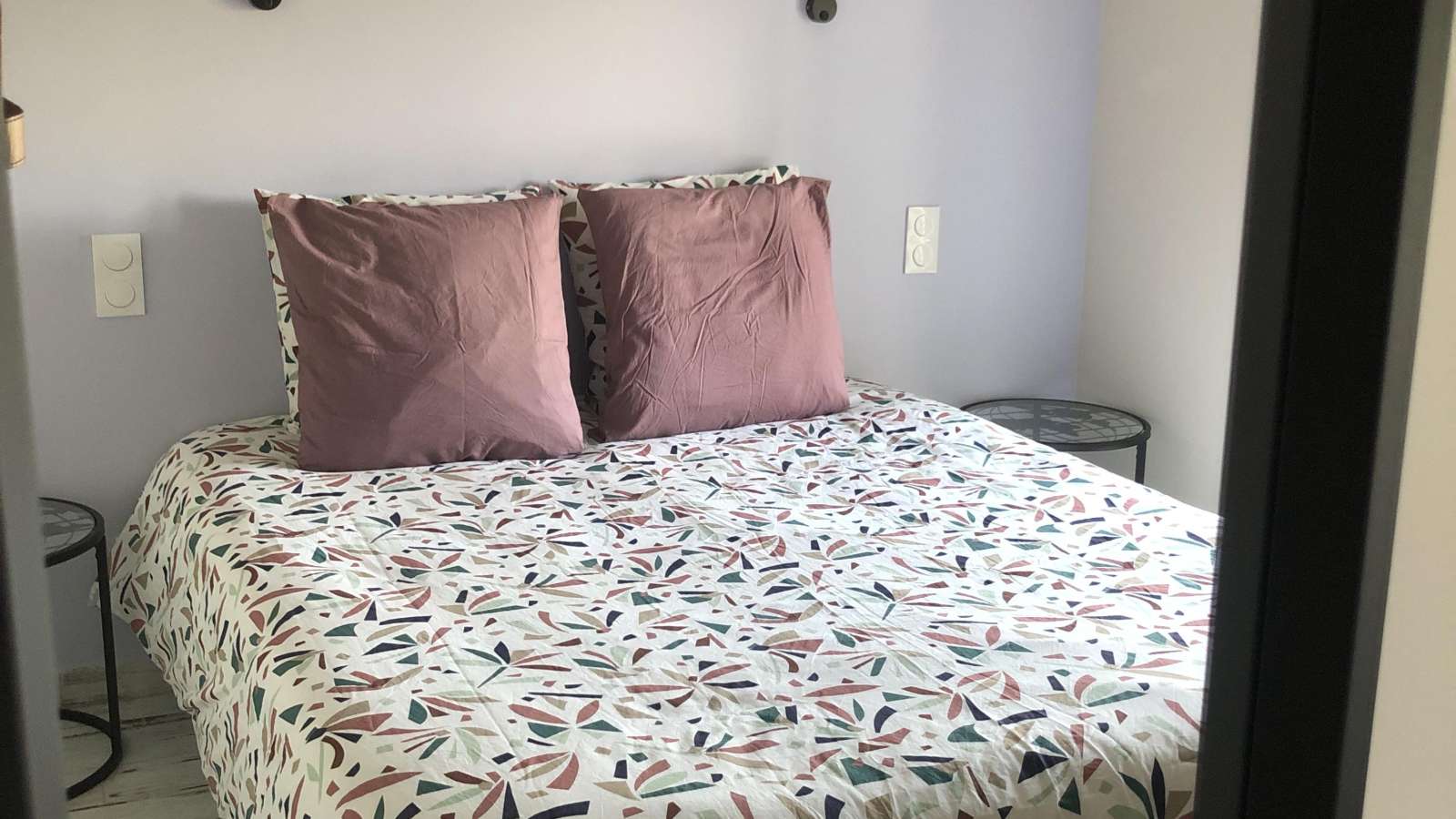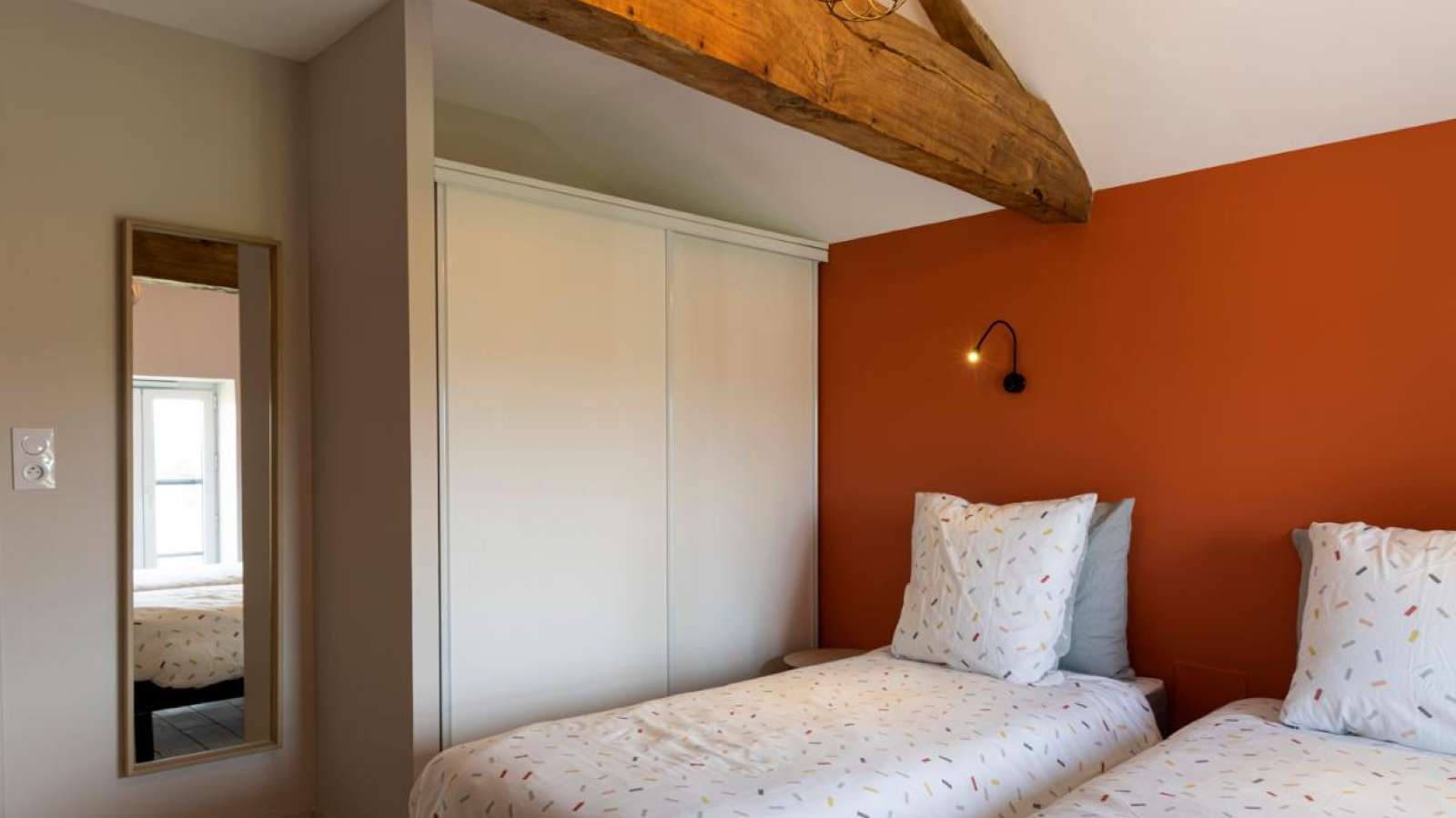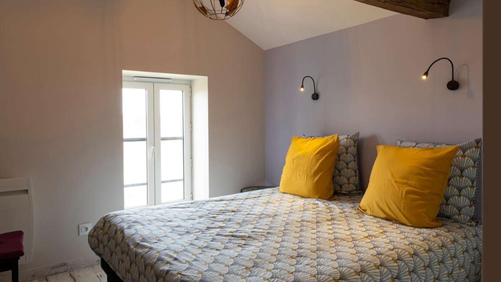 A l'étage, deux chambres. Chambre Lilas, avec un lit 160x200. Chambre Corail, avec un lit 160x200 ou 2 lits 80x200. WC indépendant.
