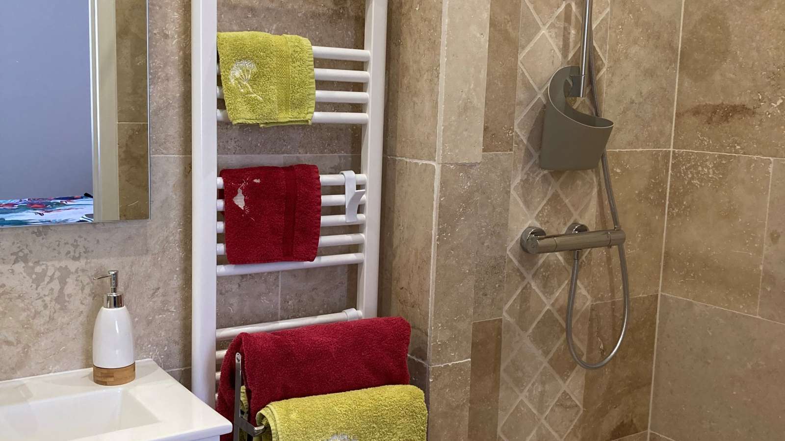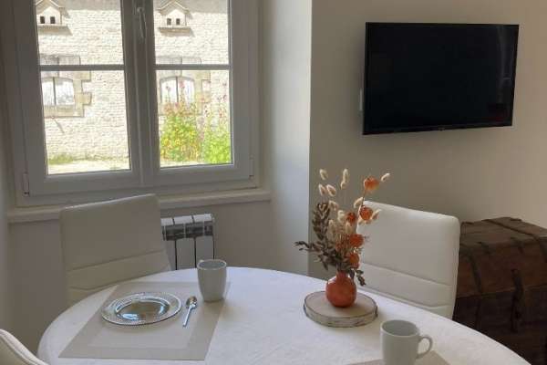 La location est accessible depuis la grande cour de ferme par un escalier de pierre. Agréable terrasse carrelée vue sur cour, levant et couchant. L'entrée se fait directement dans la pièce de vie. Côté nuit, vous attendent un lit "Queensize" grand confort et la salle d'eau attenante avec douche à l'italienne.
