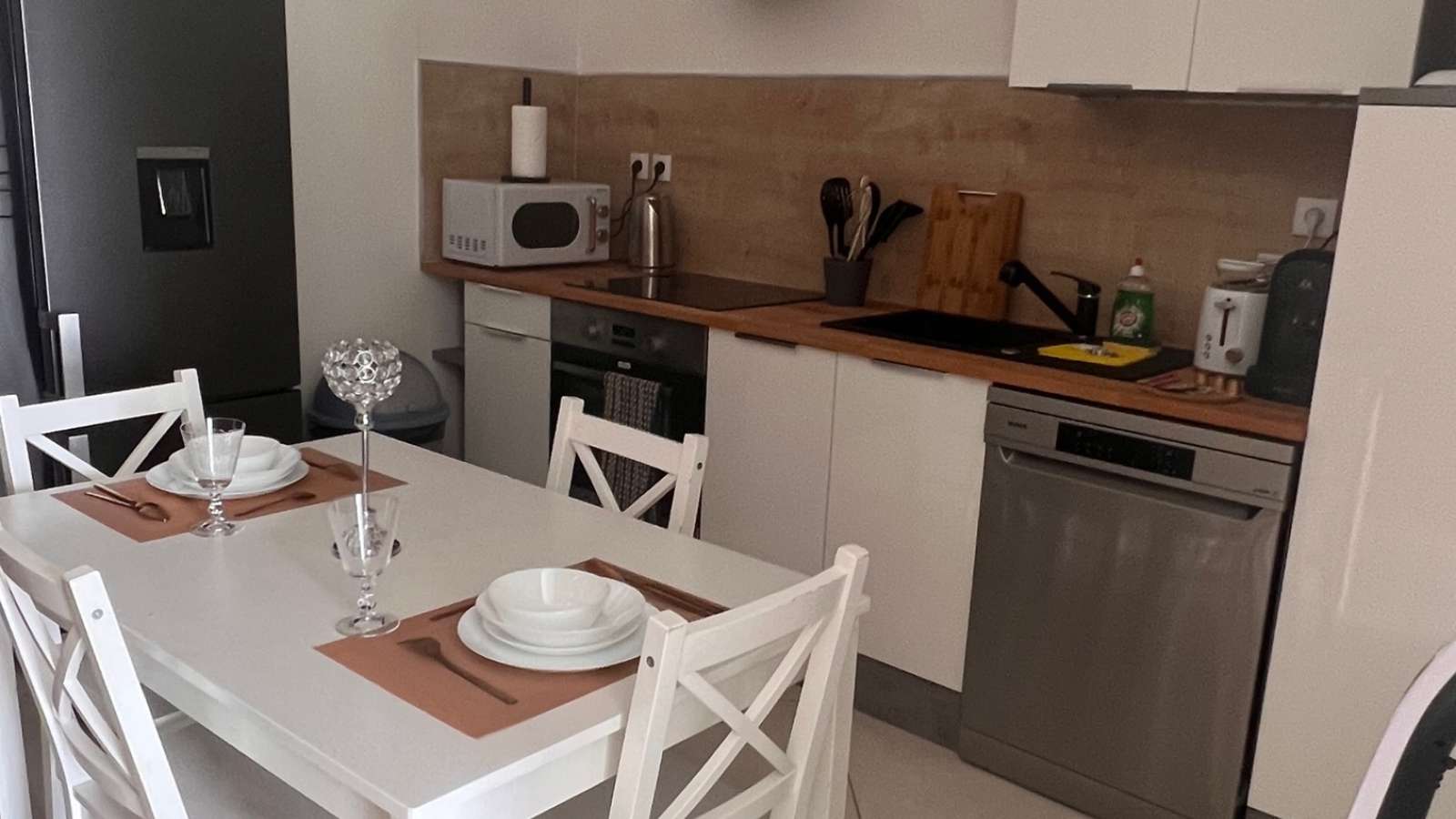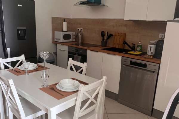 Agréable résidence composée de 6 maisons meublées de 50 m² tout confort, située à Jonzac, proche de toutes commodité , À 900 m des Thermes , 400 m de la gare ,600 m de l'hôpital ,1,3 km du centre aquatique des Antilles et à 500 m des commerces Toutes de plain pied, dotées de nombreux équipements de grand confort. Le lieu est propice au repos des résidents : lit et canapé relaxants/électriques, vaste pièce à vivre spacieuse et lumineuse, grande terrasse sans vis-à-vis & avec store, environnement calme. Les plus : espace clos, parking privé, à disposition barbecue, relax, salon de jardin… Possibilité de transport jusqu’aux thermes et commerces (avec supplément). La maison se compose : - D'une belle pièce de vie avec cuisine équipée (plaque à induction, four, micro-onde, réfrigérateur/congélateur, lave-vaisselle, cafetière, bouilloire, grille pain…) - Coin salon/salle à manger avec table et 4 chaises, canapé relaxant , grand écran plat, wifi gratuit - Une chambre avec un lit électrique queen size, 160 cm et une armoire - Une salle de bain avec vasque, douche à l'italienne, lave-linge , sèche-cheveux, fer à repasser et wc séparé - terrasse, privative avec salon de jardin et bain de soleil - Une place de parking privative devant la maison