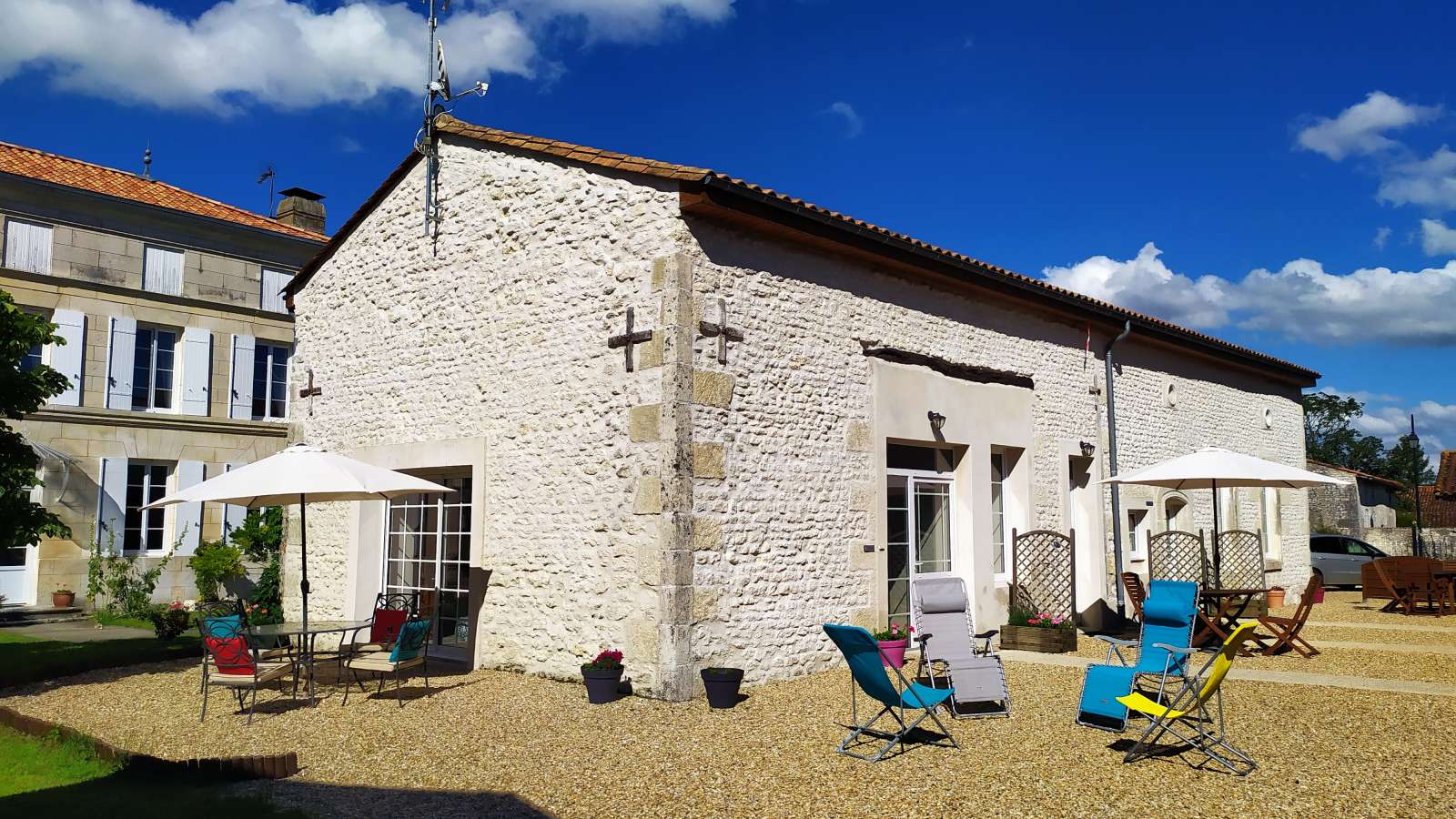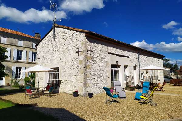 Nous vous souhaitons la bienvenue aux Gîtes du Vigneron. Nous espérons que vous trouverez nos gîtes irrésistibles. Nous sommes situés au cœur de notre petit village dans les régions de la Petite Champagne et de la Haute-Saintonge. Vous pourrez profiter au maximum de la tranquillité de la vie rurale parmi les vignes et les tournesols et de l'ensoleillement de la Charente-Maritime qui brille plus de 2 700h par an (ce qui nous confère le titre de deuxième région la plus ensoleillée de France ). À moins de 25min de notre village vous pouvez profiter du parc aqualudique des "Antilles de Jonzac" et des Thermes, trouver Cognac et les grandes maisons du cognac, visiter Saintes avec ses vestiges romains : magnifique amphithéâtre. À 45min, les plages, vous aurez le choix entre les grandes plages sableuses de l'estuaire de la Gironde à St-Georges-de-Didonne, avec ses eaux tranquilles idéales pour vos petits. Ou, quelques kilomètres plus au Nord, les belles plages de la Côte Sauvage, Fouras, Châtelaillon, les îles d'Oléron et de Ré, Fort Boyard. À une heure vous trouverez les villes de La-Rochelle, Bordeaux et Blaye qui sont à visiter mais n'oubliez pas d'aller voir aussi les vignobles qui les entourent. Vous pourrez visiter certains domaines sur réservation pour acheter du vin à la propriété. Nous avons aussi créé une salle de classe moderne, qui est le noyau de Papillon École de langue. Nous proposons des cours de langue pour l'apprentissage du français ou de l'anglais. Pourquoi ne pas réviser votre anglais pendant votre séjour chez nous ? Nous avons une grande salle (un vieux chai qui a été rénové) qui peut être louée pour des réceptions avec traiteur de notre région. Service + : possibilité de ménage avec supplément, payable à l'avance.